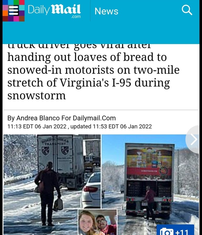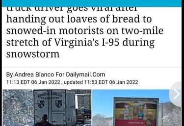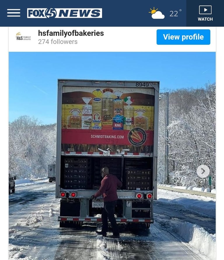 A viral story from January 2022 features Ron Hill, a truck driver for Baltimore-based H&S Bakery, who became a hero by handing out hundreds of loaves of bread and rolls to drivers stranded for over 20 hours on I-95 during a massive snowstorm in Virginia. After a couple stuck nearby contacted the company, the owner instructed Hill to open his truck, and with help from others, they distributed food to about 50 cars, bringing relief to the trapped motorists.